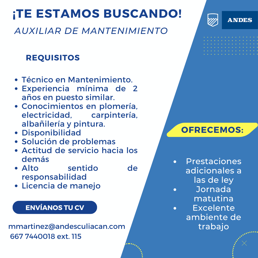 Oportunidad: Únete a la Red de Colegios Semper Altius y Prepa Anáhuac como Auxiliar de Mantenimiento. Trabaja en un entorno educativo dinámico y colaborativo, contribuyendo al mantenimiento y cuidado de nuestras instalaciones del Instituto Andes Culiacán ubicado en la primavera.